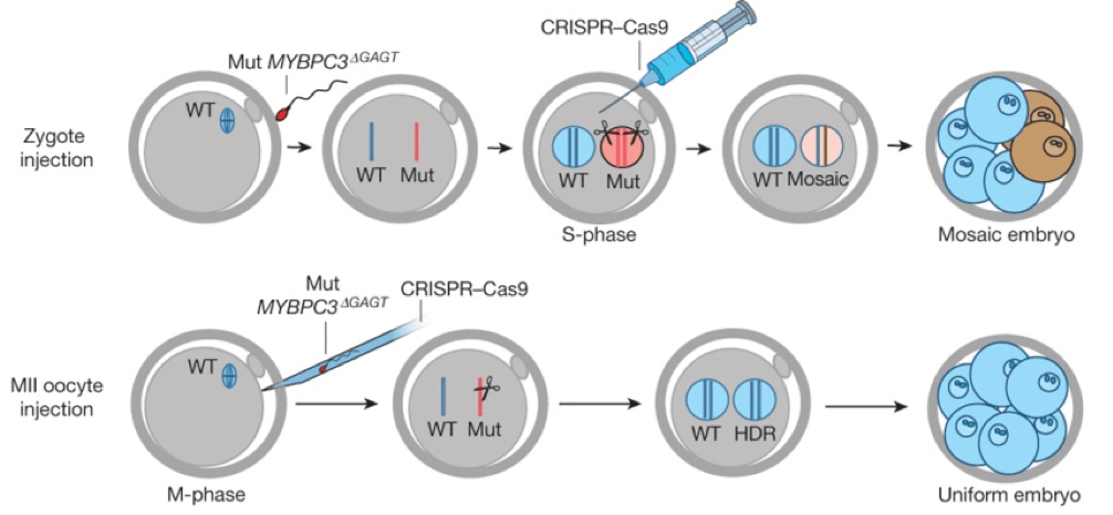研究團隊以帶有會造成肥厚性心肌症的變異基因MYBPC3的精子為實驗樣本,並和健康的卵子受精,在受精的同時,他們會注入基因編輯系統CRISPR/Cas9,在過程中,研究團隊發現CRISPR/Cas9會在DNA複製、產生胚胎前就把變異基因MYBPC3修正掉,進而創造出一個健康的胚胎,而且在 58個實驗胚胎中,有 42個都成功了。