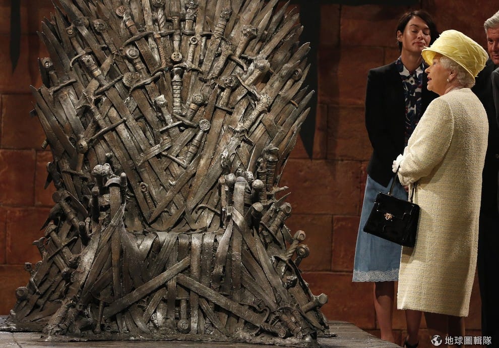 《權力遊戲》是HBO的當家影集,受歡迎程度不同凡響,自然也成為駭客的目標。圖為 2014年,英國女王伊莉莎白二世(Elizabeth II)前往位於北愛爾蘭的片廠參觀鐵王座。