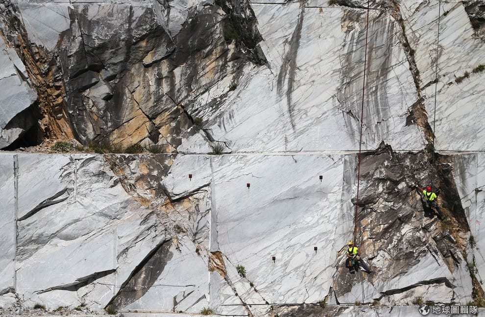 被稱為Tecchiaioli的工作人員正在大理石岩壁上工作,在開挖工作正式開始前,他們會掛在岩壁上先把鬆動的石塊移除,避免後續的開挖工作受到影響。