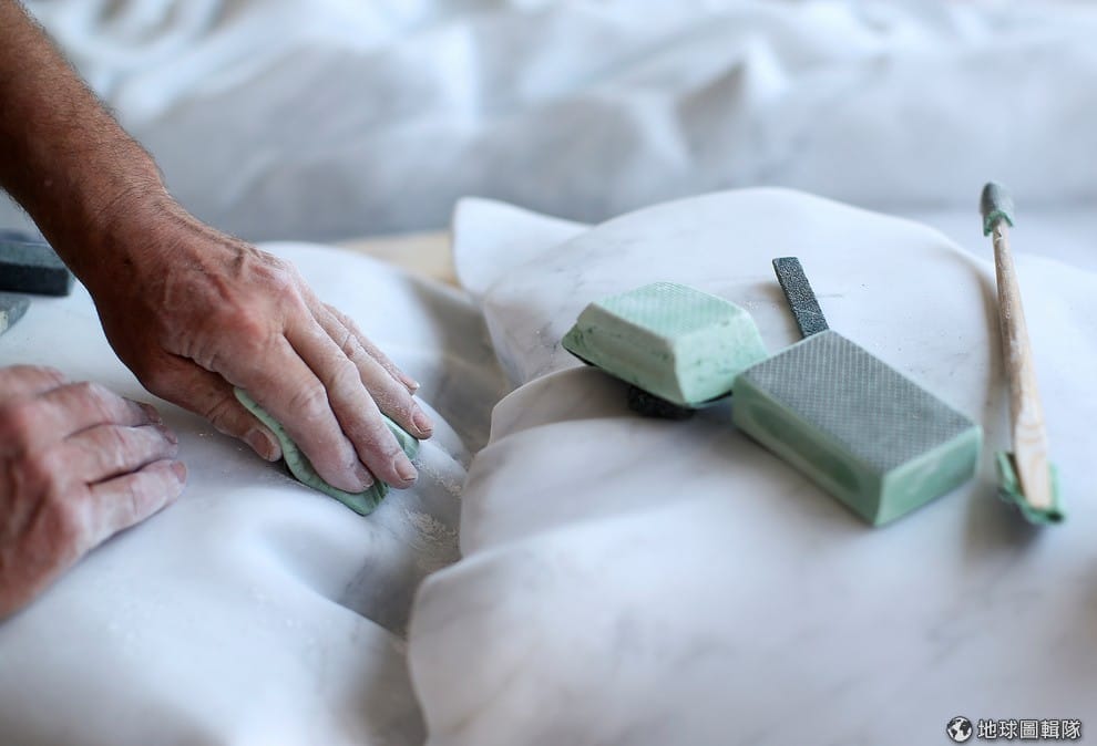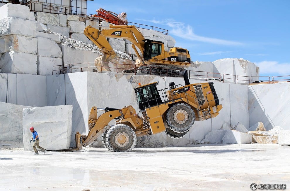 現在採石場的超現實景致恐怕連米開朗基羅都難以想像了。因為開採的緣故,採石場看起來就像倒過來的樓梯,懸掛在岩壁上的工人則像在上頭行走。當你被一塊塊純白的大理石籠罩時,也會有著身處天堂的錯覺。