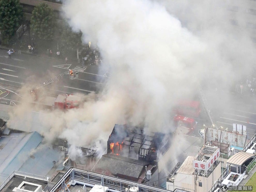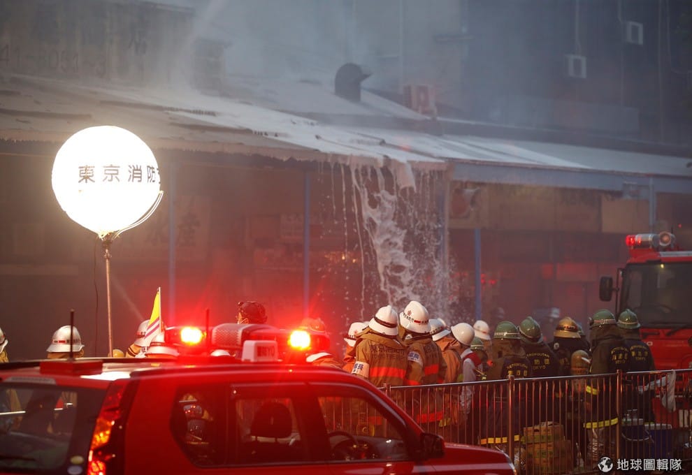在火災現場的消防員正在想辦法控制火勢。築地市場佔地 23公頃,是全世界最大的漁市場。