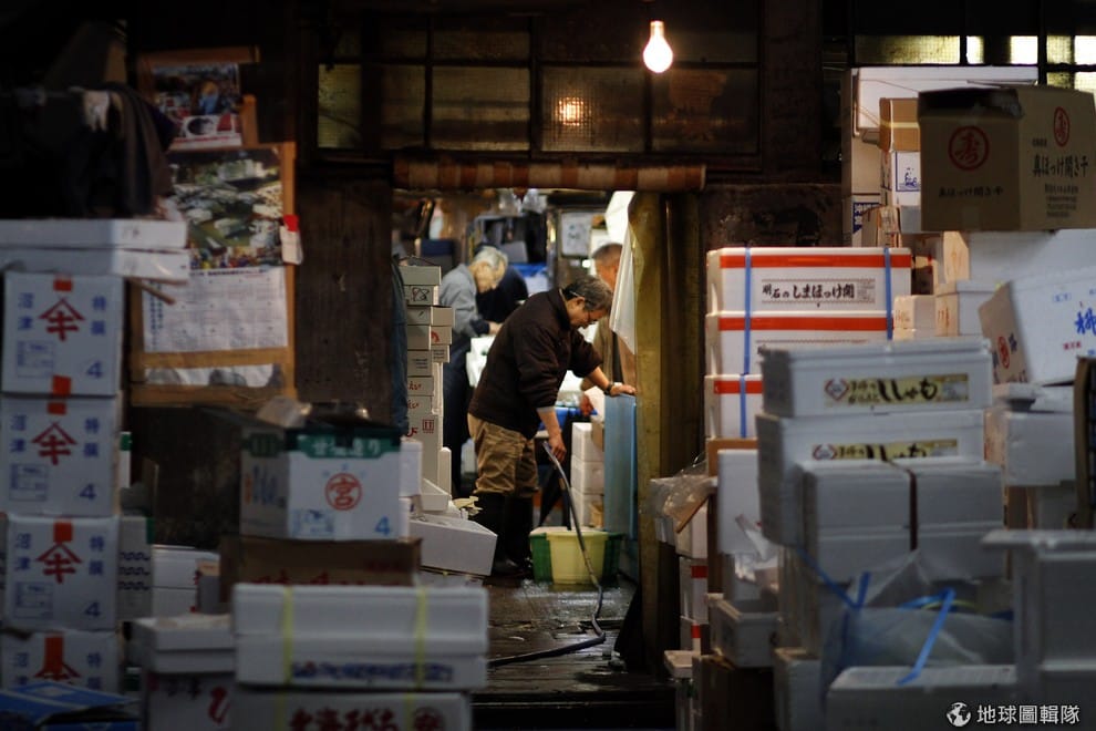2011年 3月拍到的築地市場內,員工正忙著處理手邊的漁貨。