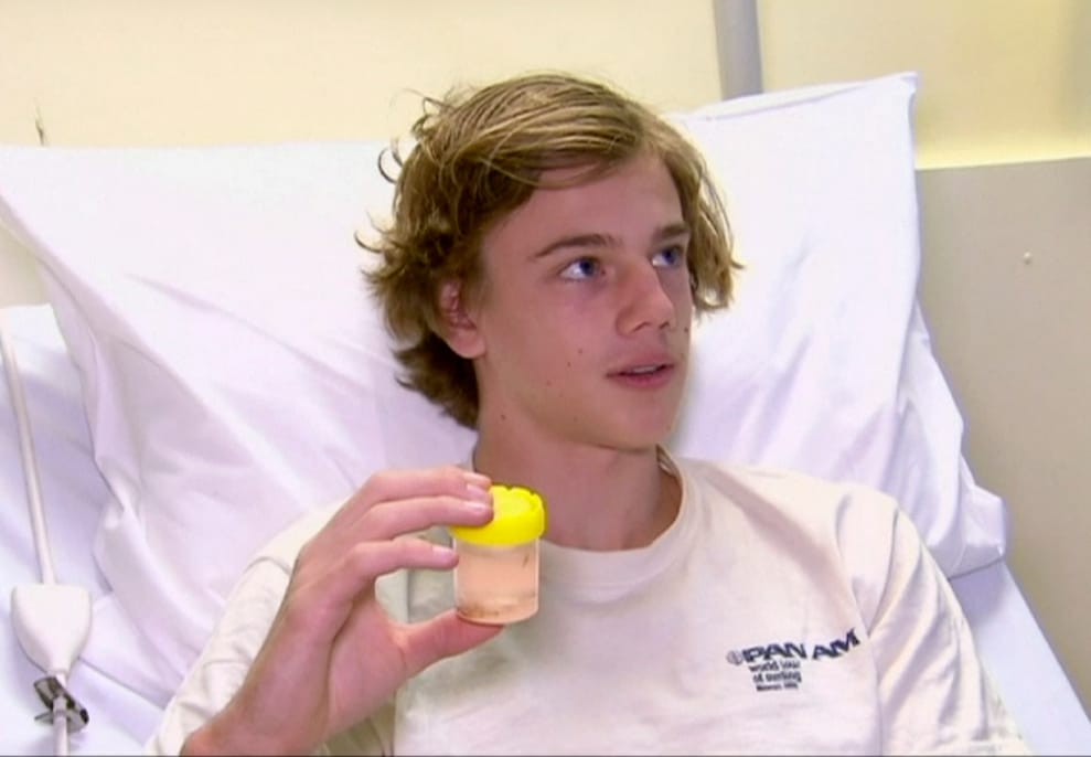 圖為遭到不知名海洋生物攻擊的澳洲少年卡內則,他手中的罐子裝著攻擊他雙腳的不知名海洋生物。