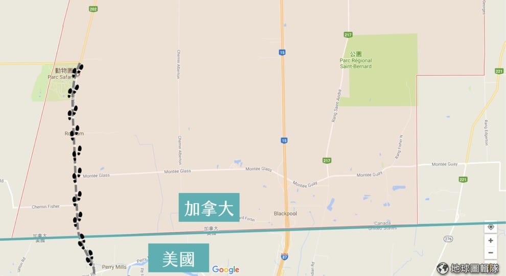 圖中灰色線即為大部分移民會穿越的Roxham公路,紅框則是整個聖貝爾納德-拉科勒社區。雖然有些人會從加拿大其他鄉村地區入境,但Roxham公路是大部分的移民會優先選擇的一條路。
