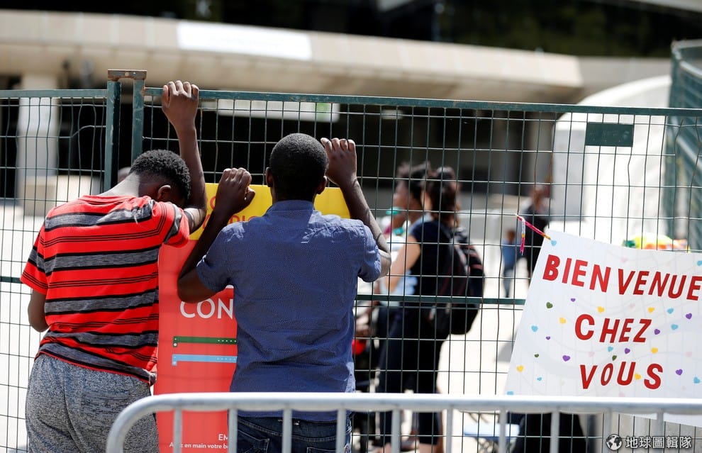 兩名年輕的難民隔著蒙特婁奧林匹克體育場外的鐵圍籬,尋找他們朋友的蹤影。