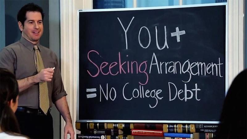 一名男子在黑板上寫下如何當好Sugar Daddy的Sugar Baby,好紓解自己的學貸壓力。