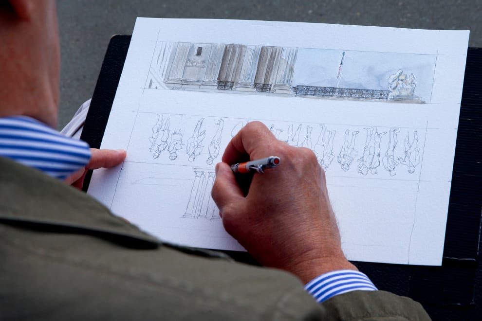 法庭畫家得有敏銳的觀察力和一雙快手,他們往往在開庭一結束就要完成手上的法庭素描。圖為正在描繪美國最高法院的法庭素描家。