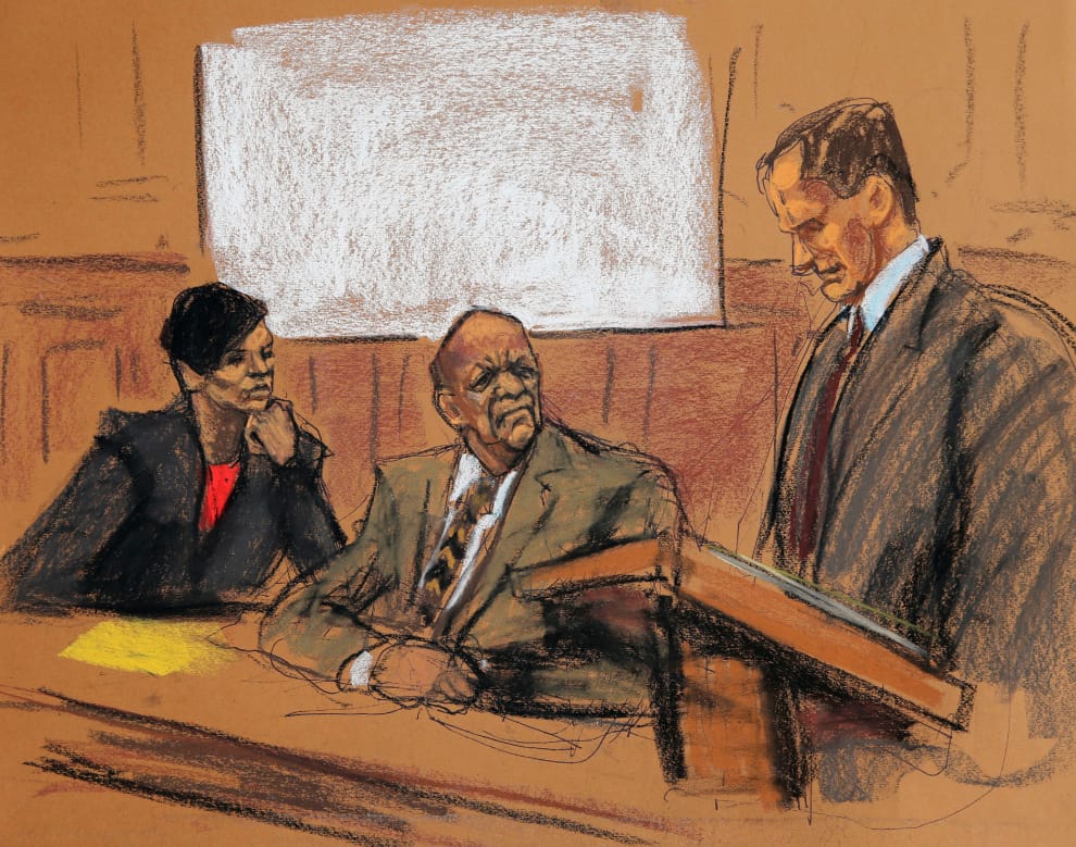 對法庭畫家來說,陪審團席的視野最好,可以清楚觀察作畫對象的一舉一動。圖為 2016年「天才老爹」比爾寇斯比(圖中)出庭時的素描。