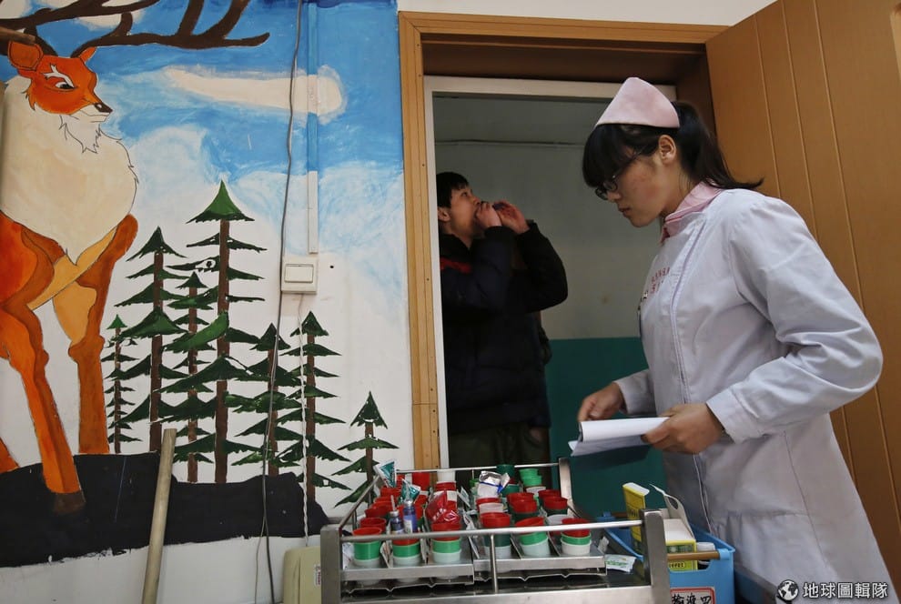2014年,在北京的網癮戒除中心內,孩子們正在接受指示服藥,這些藥被相信可以改善他們的網路成癮狀況。