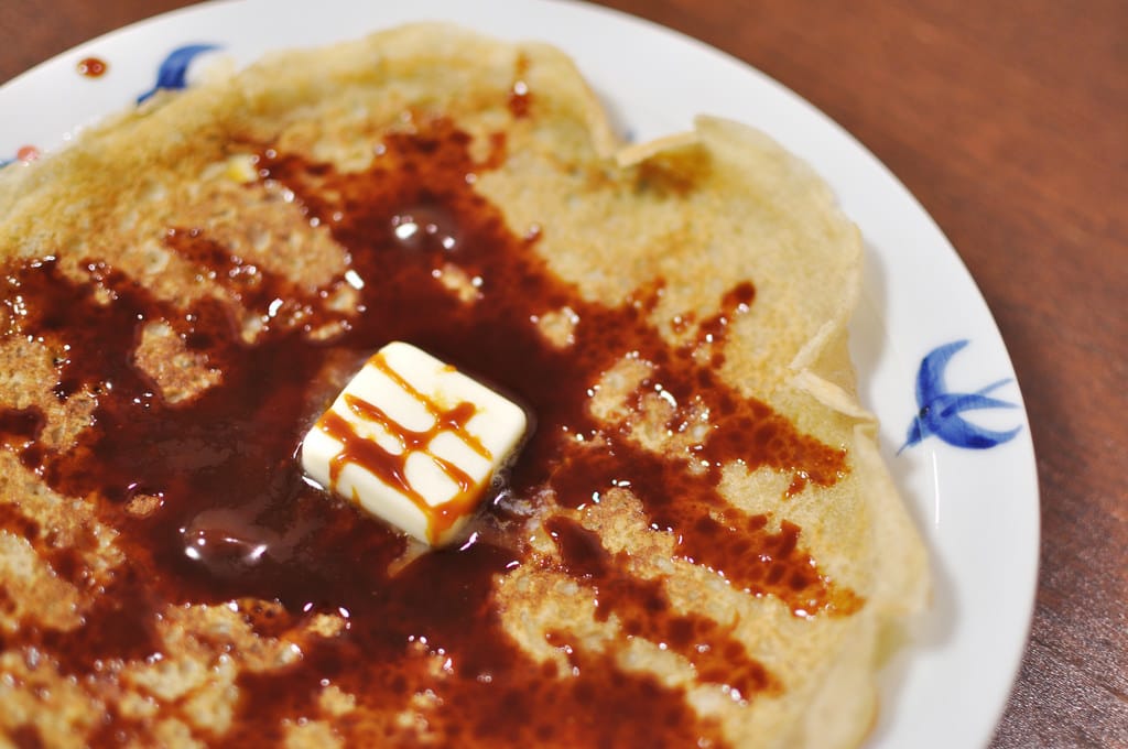在淋上糖漿的可麗餅上放下一小塊奶油,光用看得就讓人垂涎欲滴。