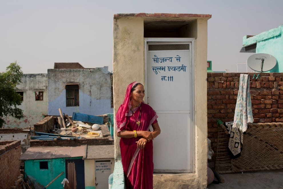 2015年10月6日,家住哈里亞納邦(Haryana)赫曼斯拉村(Hirmathla village)的坦瓦爾(Shakuntala Tanwar)在家中的廁所旁留影,她是整個村莊中第一位獲得蘇拉布國際(Sulabh International)社會服務組織提供廁所的村民。