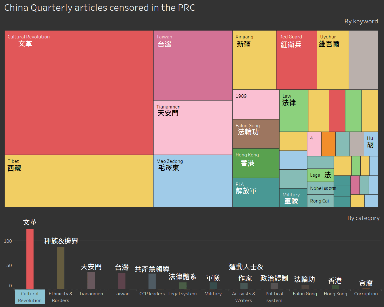 透過德國漢學家恩格曼(Puck Engman)的整理,可以看到《中國季刊》中最容易被下架的文章含有那些關鍵字。