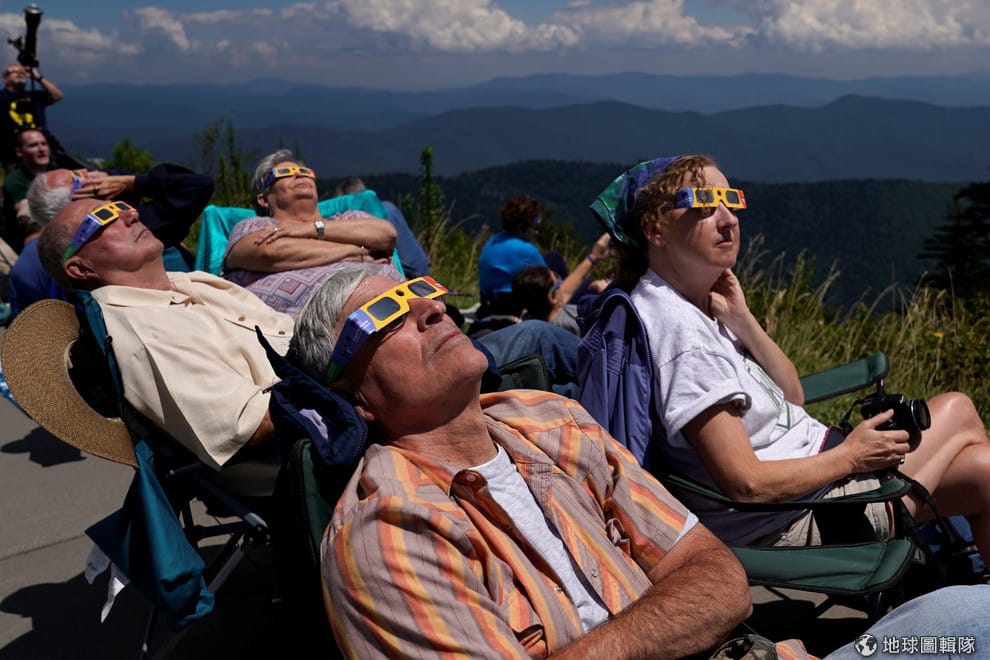 在田納西州海拔 2,025公尺的國家公園,人們喬好姿勢、戴起日蝕觀賞眼鏡準備一睹日全蝕的風采。