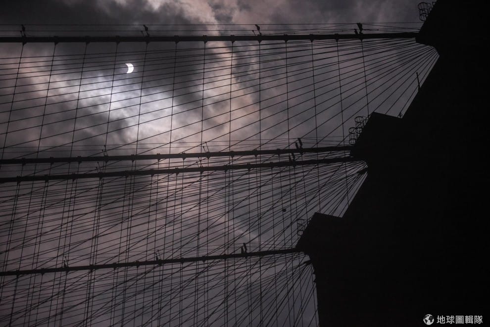 在紐約市布魯克林大橋,當日蝕開始後,只見天色逐漸暗下來,氣溫也隨之驟降。
