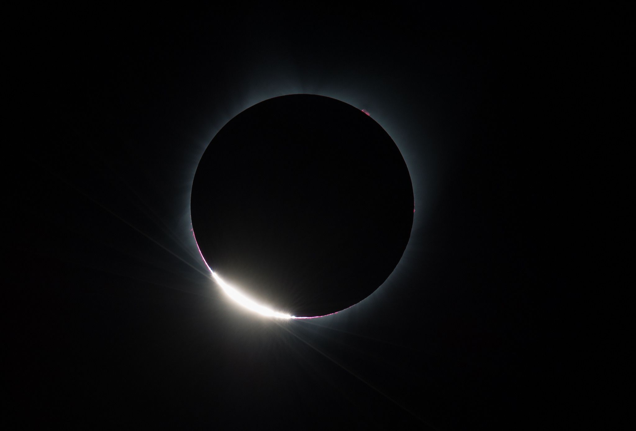 網友NASA HQ PHOTO在月亮遮蓋住太陽的前一刻,光線從月球崎嶇的地形漏了出來,出現鑽石環(也稱倍里珠, Baily's beads)現象。