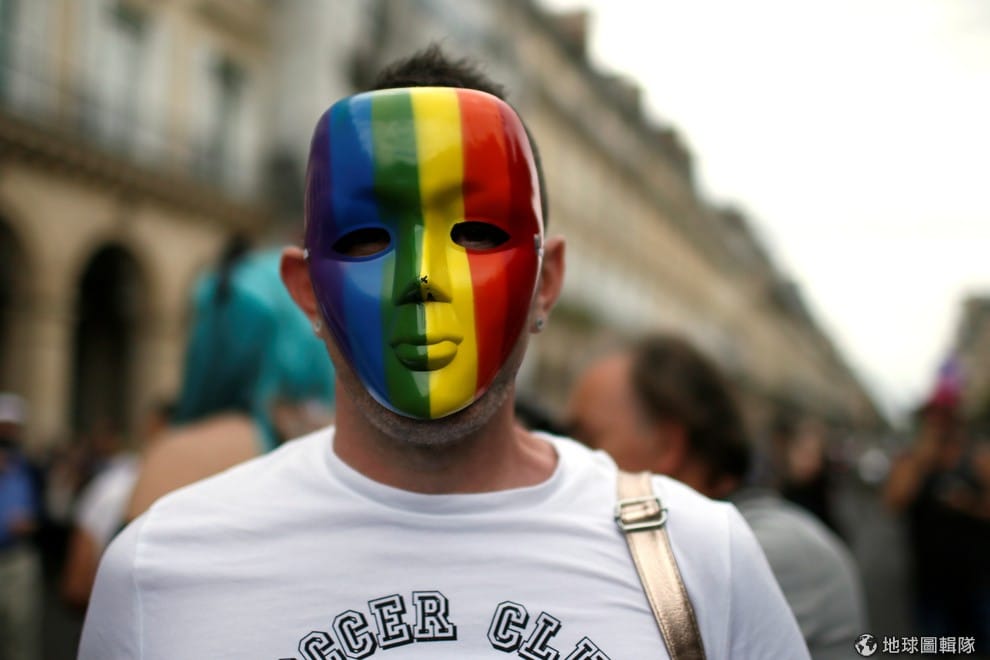 2017年 1月,一名男子戴著畫有彩虹色彩的面具,在巴黎參加一年一度的同志大遊行。
