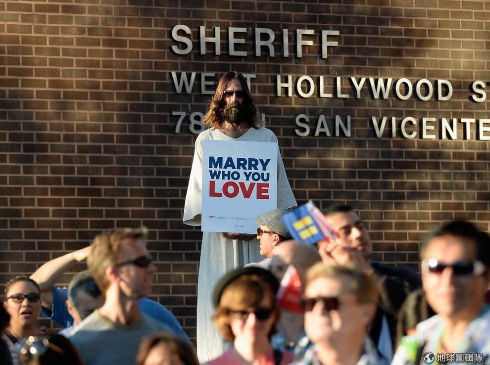 裝扮成耶穌的民眾身上的牌子寫著「和你愛的人結婚」