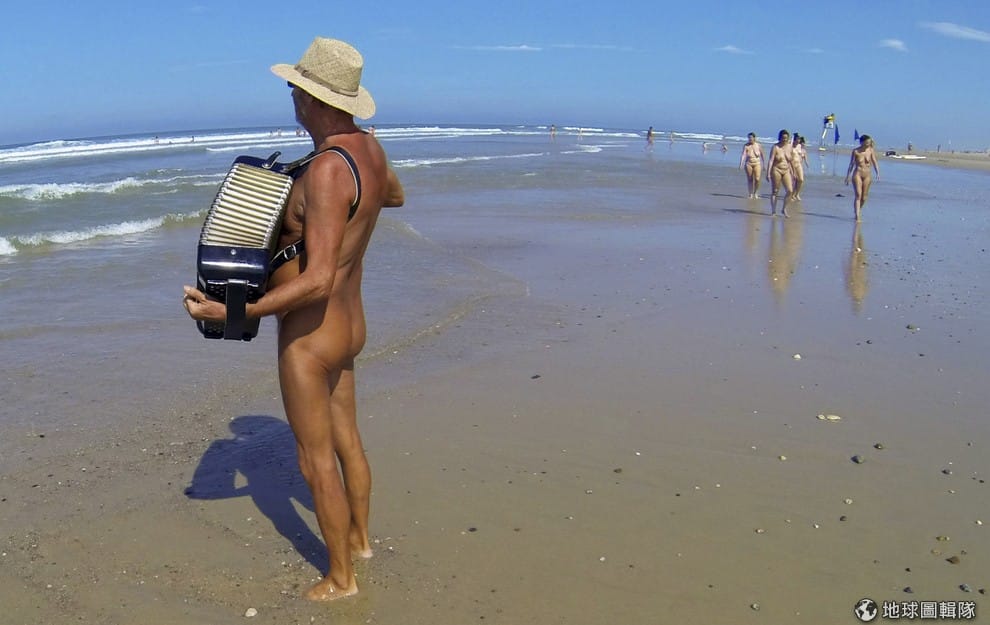 2013年 8月,在法國的沿海市鎮旺代蒙塔利韋(Vendays Montalivet),一名音樂家在天體營光著身子彈奏音樂。