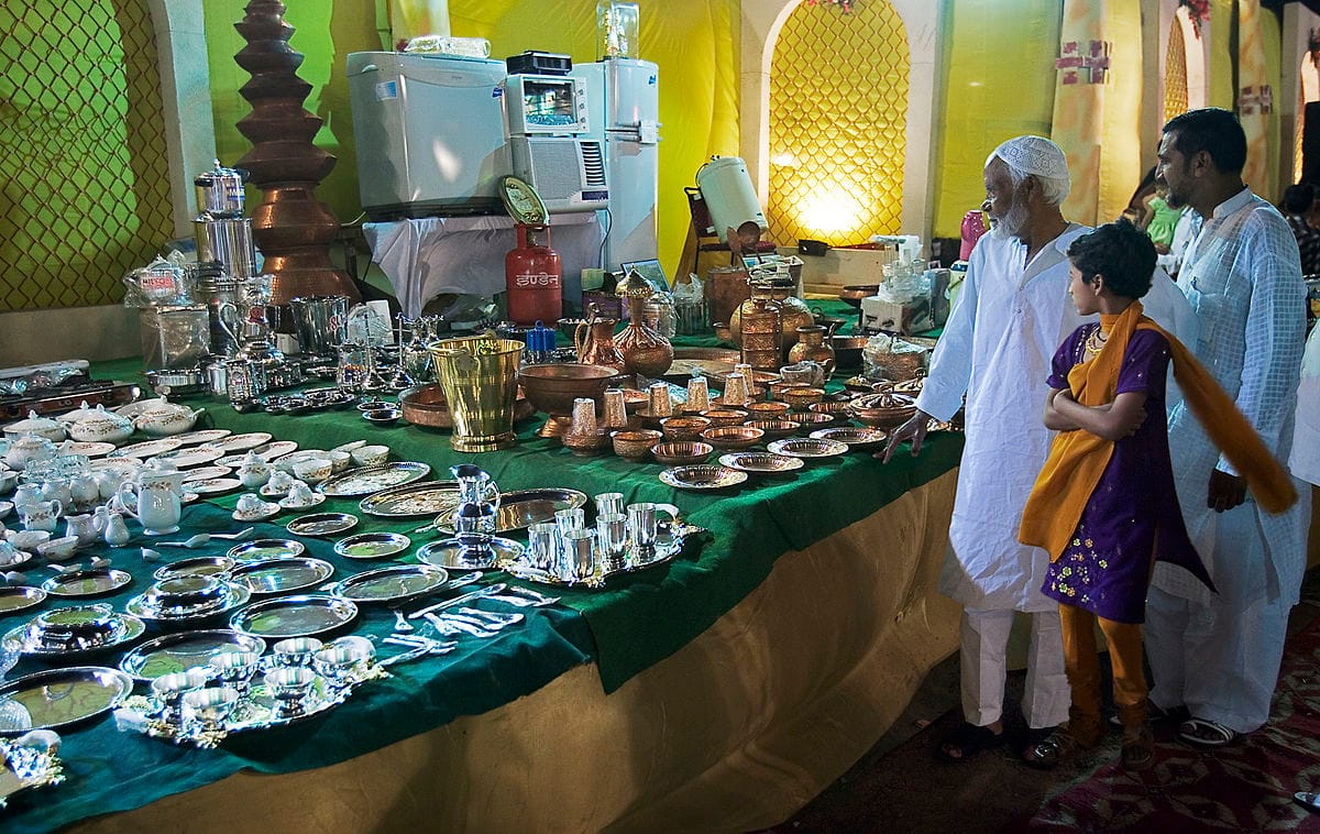 在 2005年的德里,畫面中要送給男方的禮物全部一字排開地展示在平台上。