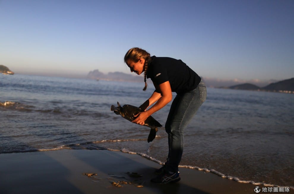 路透社除了教人如何當一條稱職的美人魚,巴西美人魚教練芙塞琪(Luciana Fuzetti)也會不時注意海灘上的情況,圖為她正在幫一隻海龜解圍。
