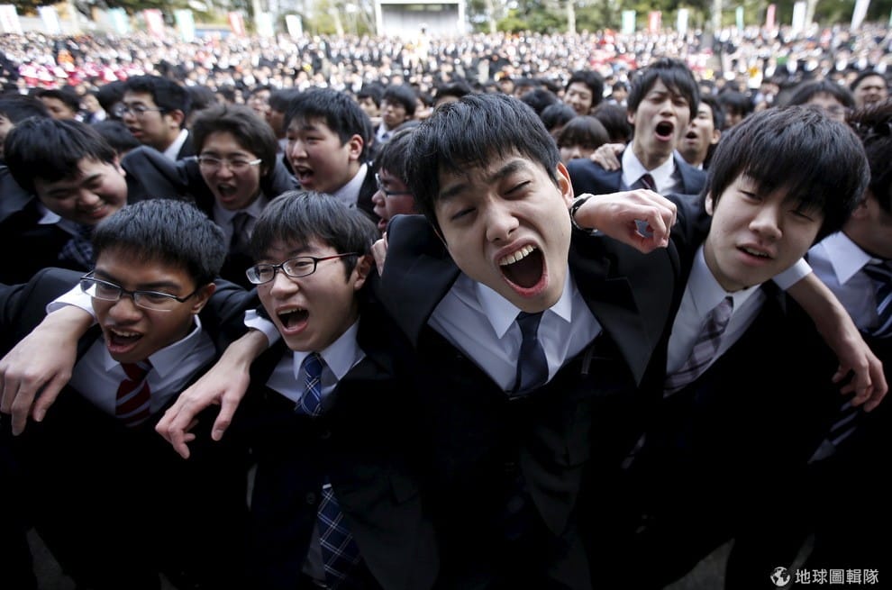 2016年,一群準備參加求職活動的日本大學生肩併肩地互相打氣。