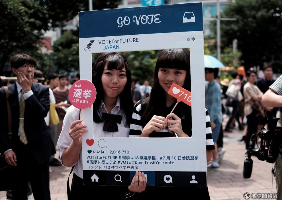 遇到特殊場合需要人來假扮某個角色嗎?那麼就交給龍川隆一的事務所吧!圖為 2016年6月,高中生在Instagram風格的畫框前合照,呼籲其他年輕人去參加正在進行的議會選舉。