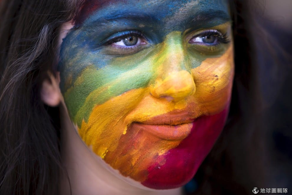 一名女子將支持LGBT族群的彩虹旗畫在自己的臉上。近日,史丹佛大學利用人臉辨識技術找出誰是同志的研究,引起軒然大波。