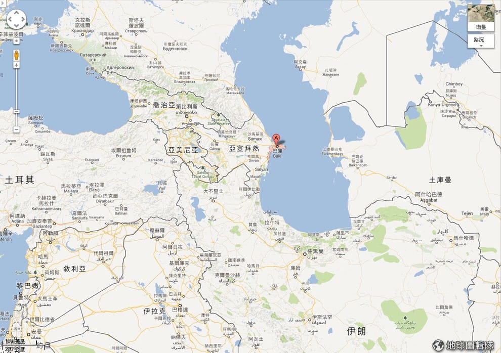 照片中紅色的標記處就是亞塞拜然首都巴庫。亞塞拜然(Azerbaijan)位在外高加索地區,東臨裡海,北接俄羅斯,西與亞美尼亞、喬治亞為鄰,南接伊朗。