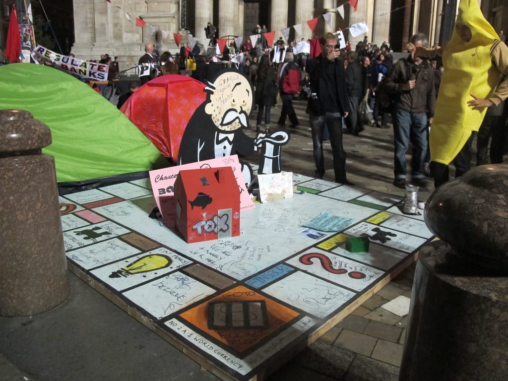 2011年,英國知名街頭藝術家班克斯(Banksy)在倫敦聖保羅大教堂設置了「3D大富翁」,藉此諷刺當今人們以貸款滿足物欲的情況。