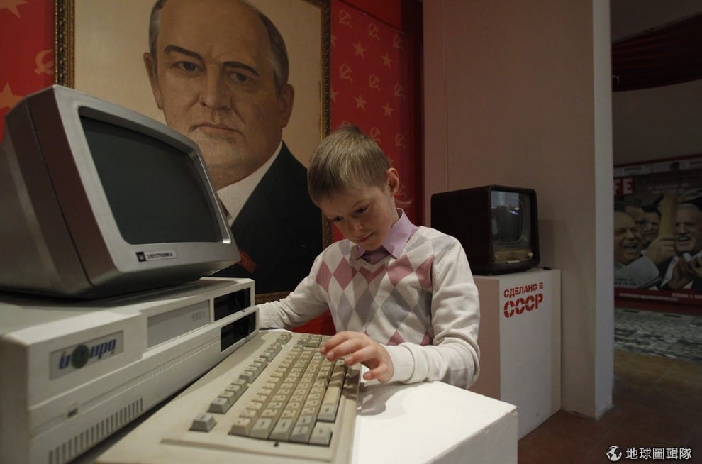 在莫斯科蘇聯博物館內,一名女孩正在參觀蘇聯時期製作的電腦。冷戰時期,美蘇兩方除了有太空競賽、核武競賽、軍備競賽,在科技發明上也互相較勁。