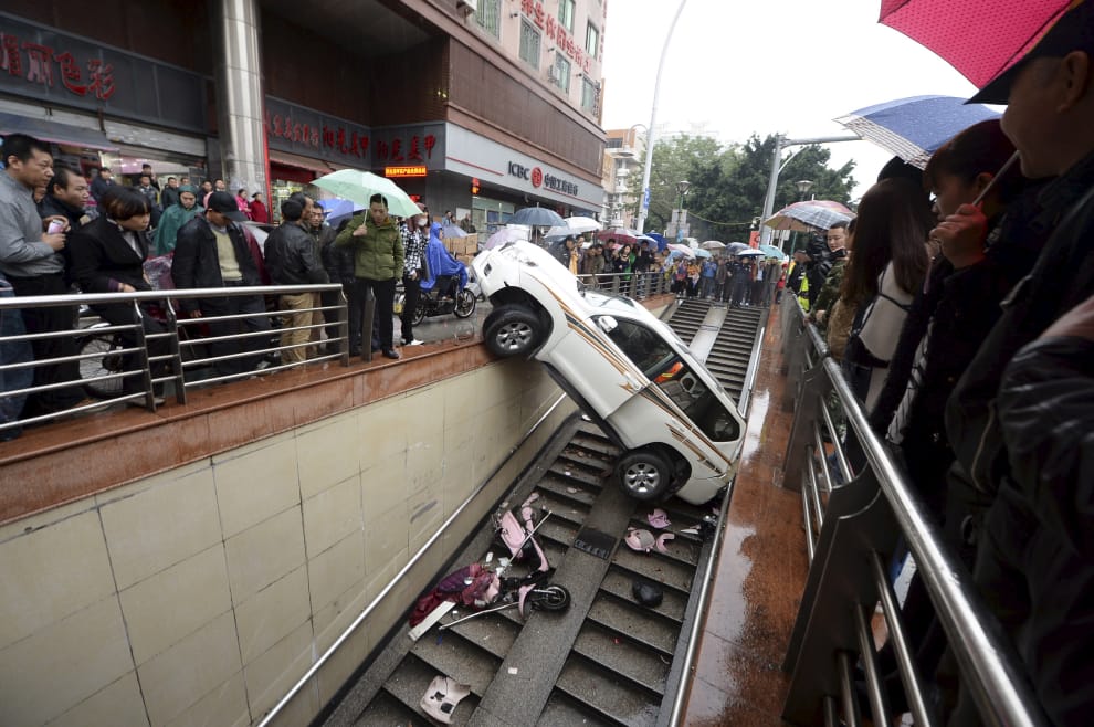 一名心理學家認為,觀看事故發生其實是人之常情。2015年12月9日,在中國福建省福州市,人們在階梯旁圍觀一台不小心掉進地下人行道的車輛。