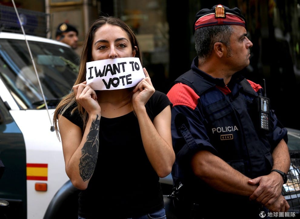 在西班牙警察突襲加泰隆尼亞外交部的建築物外,一名女子把「我想要投票」的標語放在嘴邊,對警察的突襲行動做出無聲抗議。