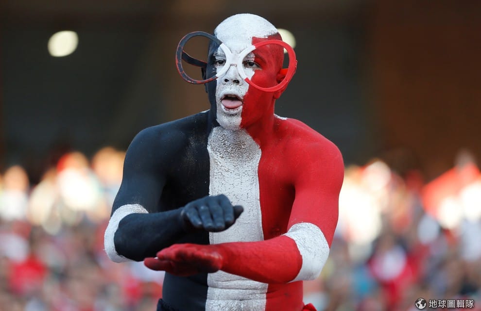 2016年 11月的足球比賽中,一名粉絲把自己全身塗上了代表國旗的顏色,表達對埃及球隊的支持。
