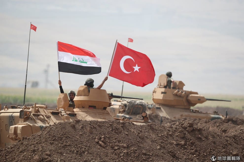 路透社周二,土耳其和伊拉克在庫德斯坦自治區邊界進行聯合軍演,軍人們手拿伊拉克(左)和土耳其(右)的國旗。