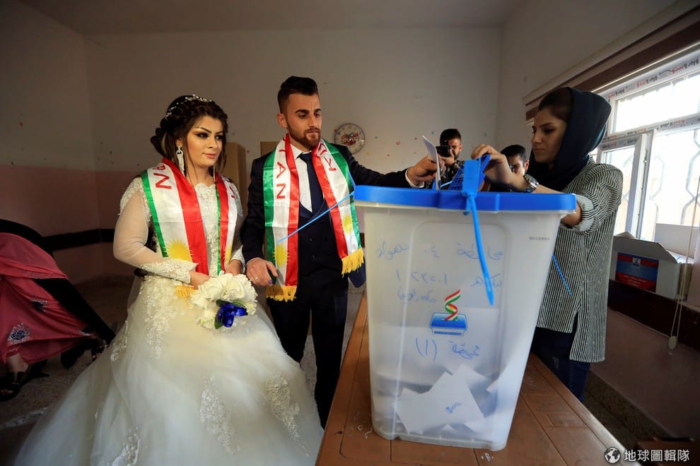 一對庫德族新人在結婚這一天,相偕來到投票所投票,他們披著印有「庫德斯坦」字樣的披帶。