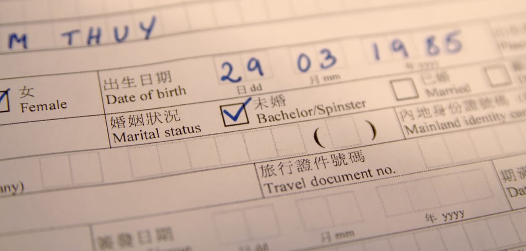 2009年,一名攝影師拍下了香港的入境表格,其中未婚欄的英文寫著「單身漢/老處女」。