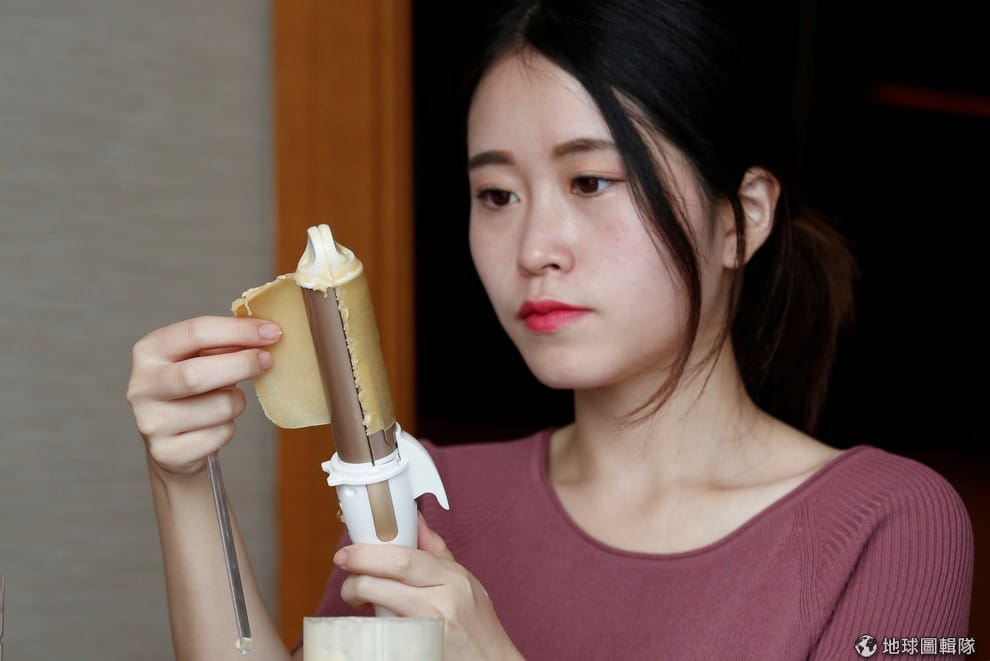 在香港的飯店接受《路透社》訪問時,小野則在現場示範用電棒捲做蛋捲。