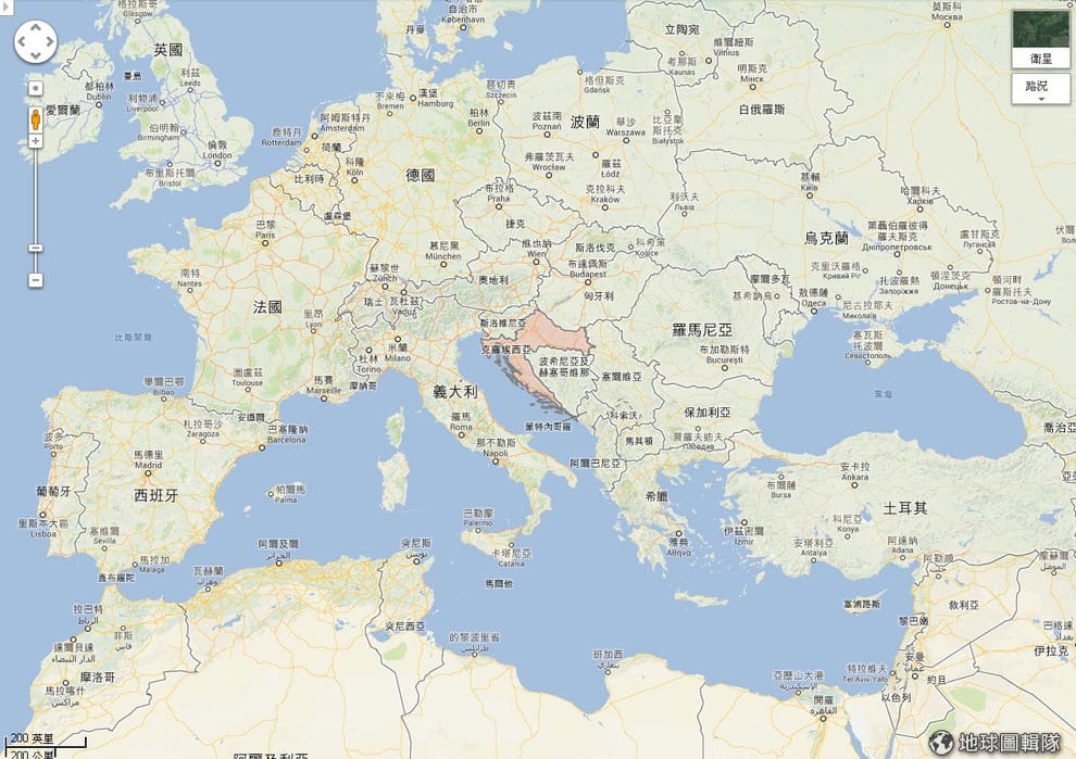 照片中的橘紅色塊就是克羅埃西亞,它位處於地中海及巴爾幹半島潘諾尼亞平原的交界處。克國的國土面積大約是56,542平方公里,約為台灣的1.5倍大,人口約440萬人,每年大約有1,000名觀光客受到當地優美的海岸線吸引,到當地度假。