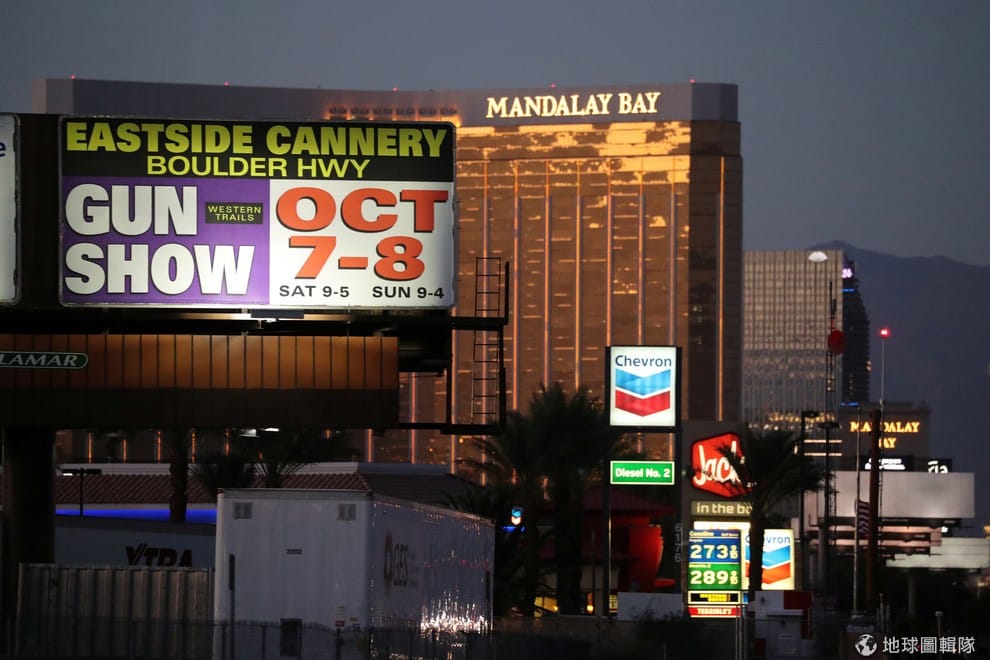 在發生賭城演唱會槍案的曼德勒海灣賭場渡假村(Mandalay Bay Resort and Casino)前,大大的看板上宣傳即將在 7號登場的槍枝展。
