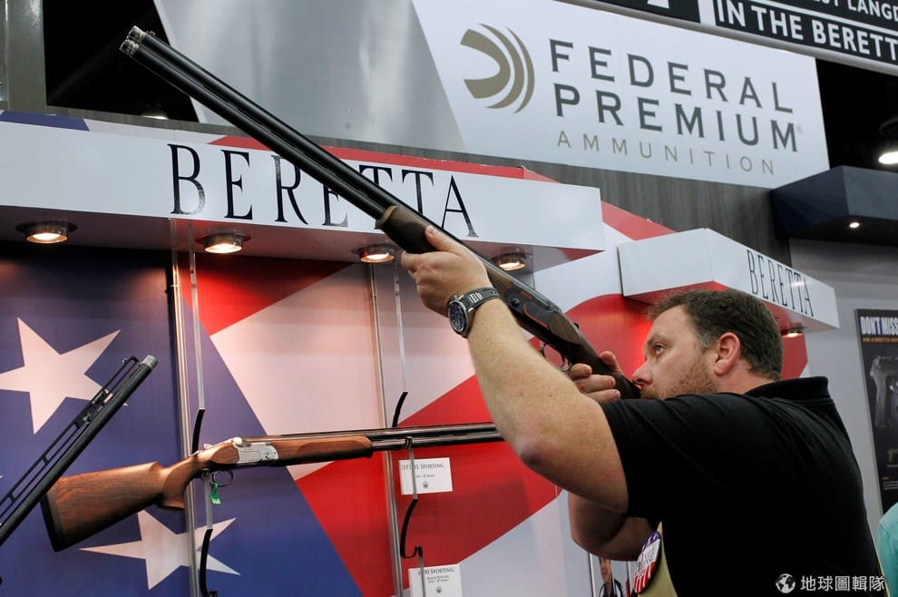 2016年,在肯塔基州的全美步槍協會年會上,一名參加民眾把玩著手上的獵槍。