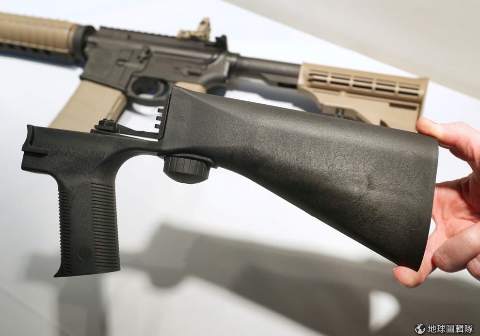 圖中左方黑色的裝置就是現在最夯的「撞火槍托」,只要把它加裝在半自動步槍上,就可以產生全自動步槍的效果,又不用擔心犯法。