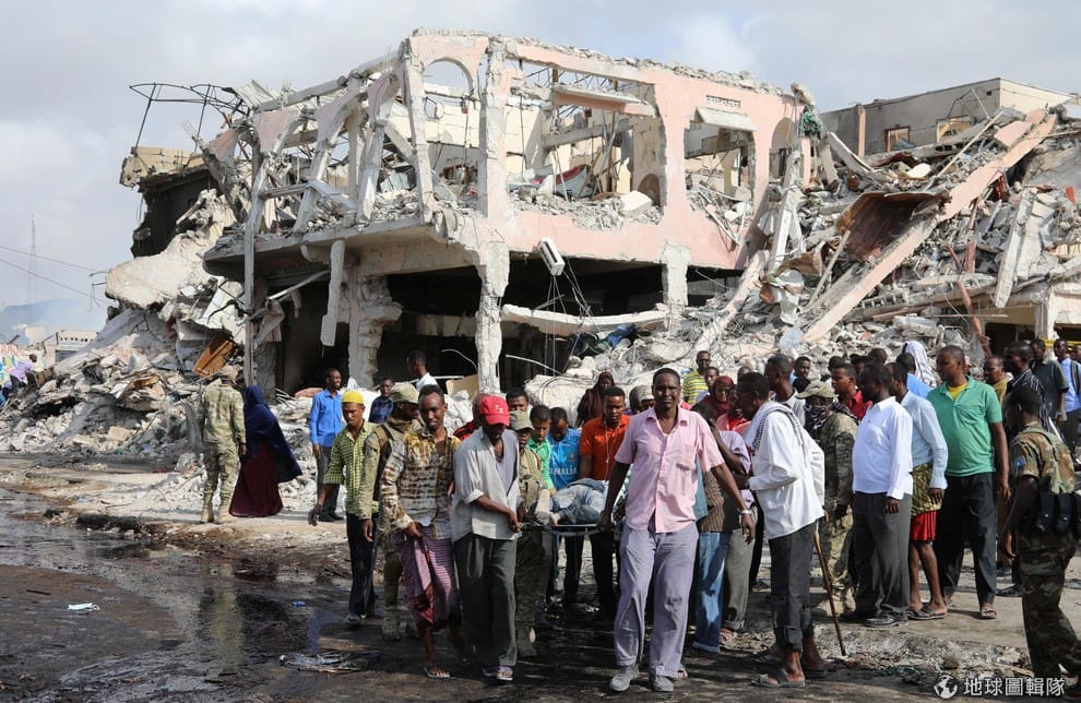 在一片廢墟中,民眾和救難人員抬著從瓦礫堆挖出的一具具遺體,這裡是遭到卡車炸彈攻擊的索馬利亞首都摩加迪休。