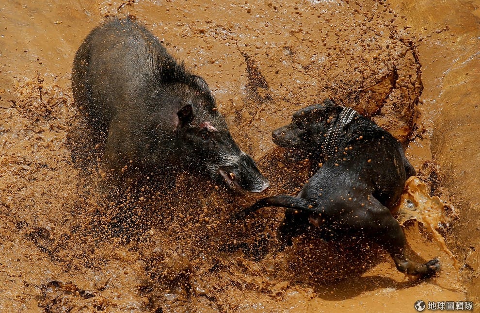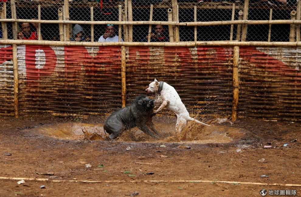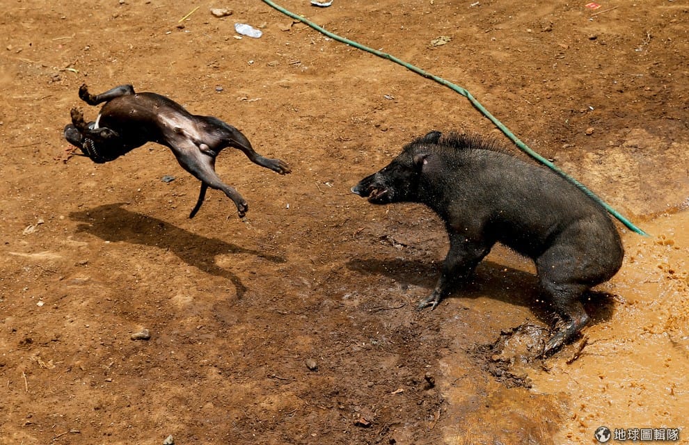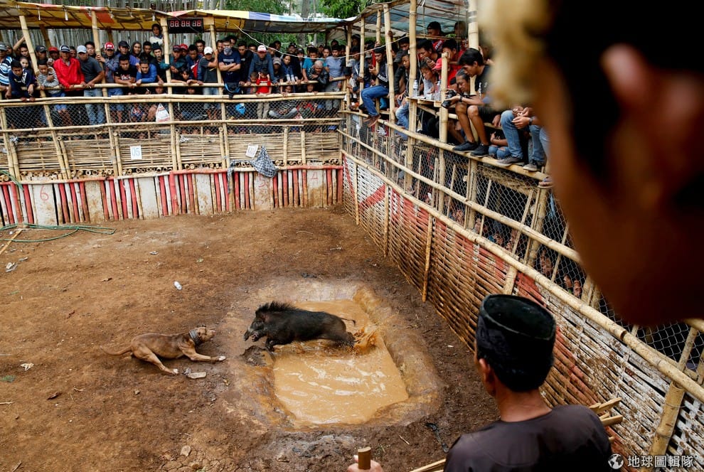 在印尼西爪哇省的村落,一隻狗和野豬在賽場上大打出手,牠們正在進行「野豬打鬥」。