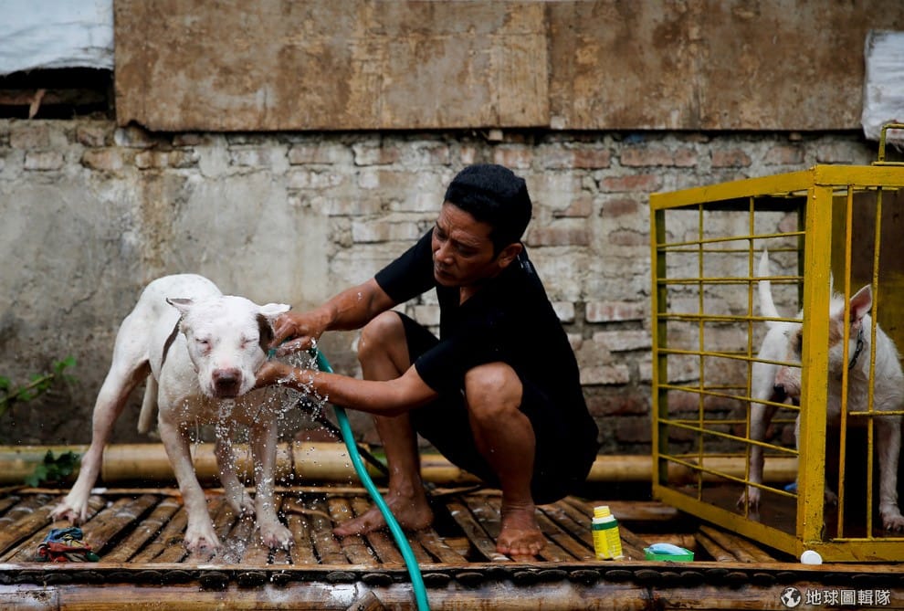 狗商阿布正在清理他的狗狗,準備把牠帶上競技場。