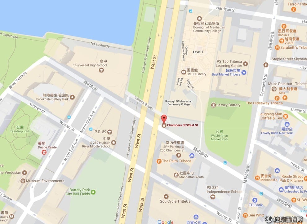圖中紅標處是曼哈頓下城區的錢伯斯街(Chambers St.)與西街(West St.)交界口,也是卡車最後停下來的地方。這一帶除了是熱門景點,也有許多學校在附近。