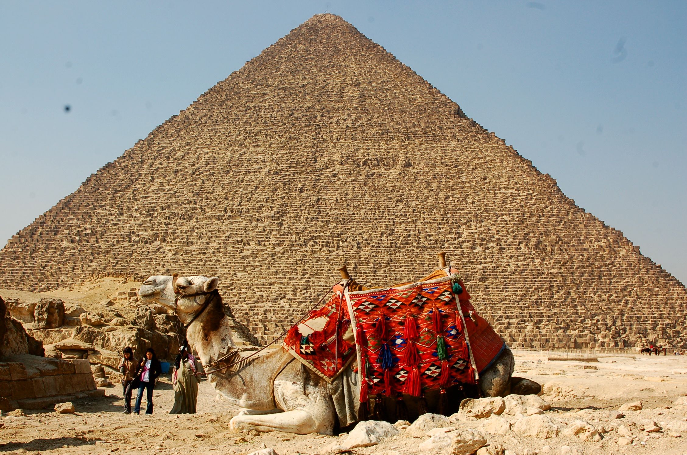 一隻駱駝坐在古夫金字塔前方,等待著下一個想要騎駱駝的觀光客到來。