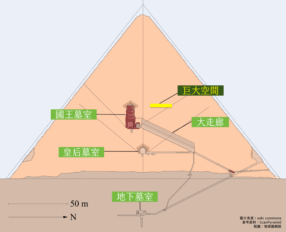 圖為研究示意圖。古夫金字塔建於西元前 2,560年左右的古埃及第四王朝,目前已知內部有三個墓室及好幾條通道,而新發現的巨大空間就座落在國王墓室、王后墓室以及「大走廊」(Grand Gallery)上方。