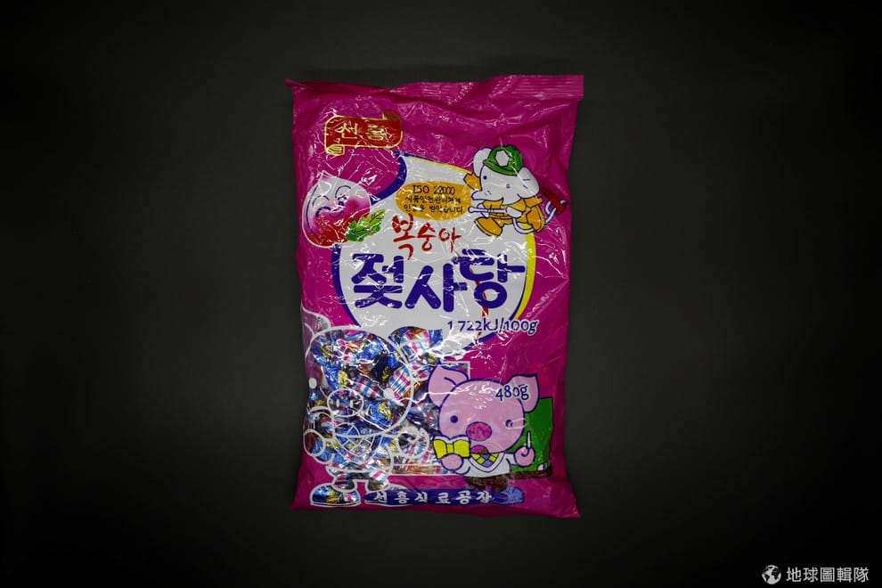 圖為北韓出產的糖果,封面有小豬的圖案和熱量標示。