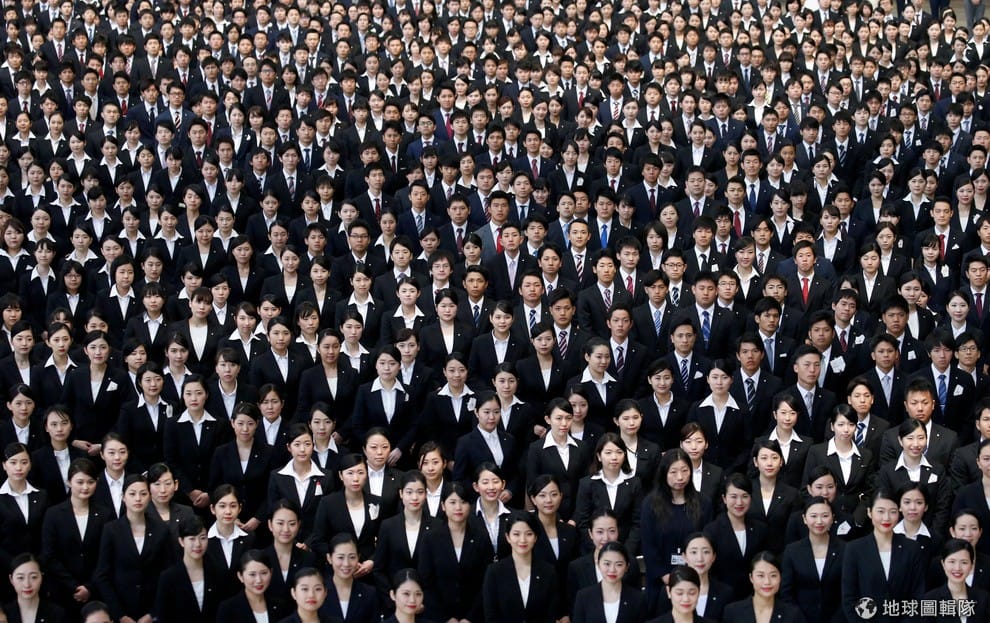 今年 4月,在東京羽田機場日本航空的機庫內,新加入日航的職場新鮮人穿著正裝列隊拍照。許多日本學校對服儀有著非常嚴厲的規範。
