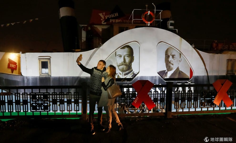 在克拉斯諾亞爾斯克(Krasnoyarsk),一對情侶和印有俄國末代沙皇尼古拉二世(Nikolas II,左)和蘇聯領導人列寧(右)照片的蒸汽船留影。
